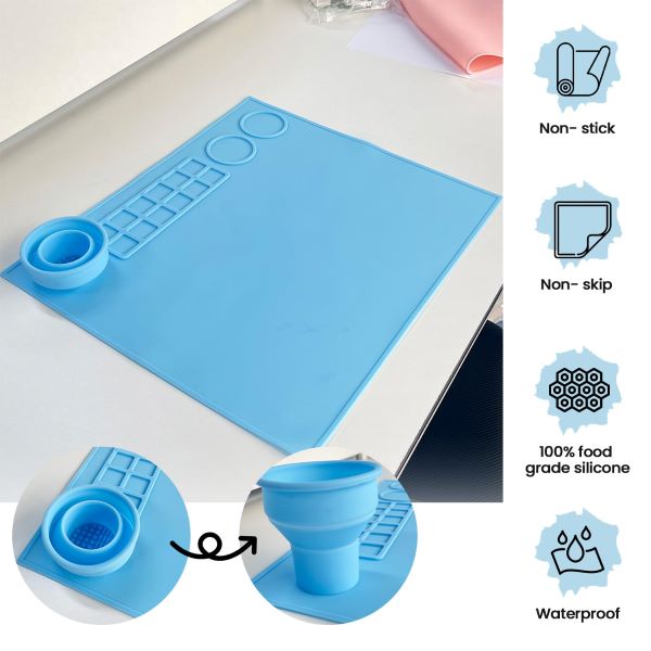 Pagamintas iš 100 % maistinio silikono, šis vandeniui atsparus, nelipnus ir neslidus kilimėlis puikiai tinka visiems jūsų rankdarbių poreikiams. Jame yra 14 duobučių ir maišymo zona, todėl jis puikiai tinka jūsų reikmenims tvarkyti.