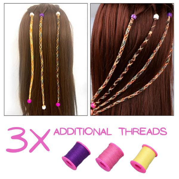 Pakuotės turinys: Komplekte: 1x „Whizzbraid“ mezgimo priemonė, 12x plaukų segtukai, 3x siūlai (geltonas, rožinis ir violetinis siūlas), 2x priedai, kad būtų lengviau naudoti