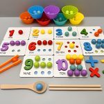 Lazdelės ir šaukštai stiprina suėmimą bei rankų ir akių koordinaciją, kai karoliukai judinami ir rūšiuojami.